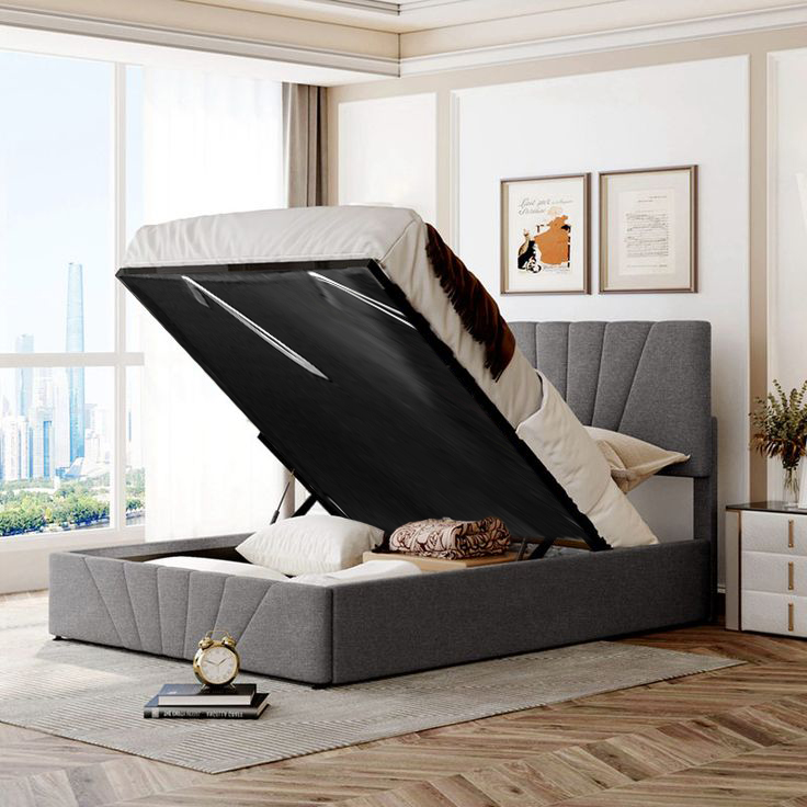 Maximize your bedroom space with this modern hydraulic storage bed, upholstered in premium dark grey fabric. Featuring a stylish panelled headboard and base with subtle geometric stitching, it offers both a contemporary look and hidden functionality. The easy-lift hydraulic system opens up to reveal a spacious compartment—perfect for organizing blankets, bedding, or seasonal items. Ideal for apartments or homes where space-saving solutions matter.