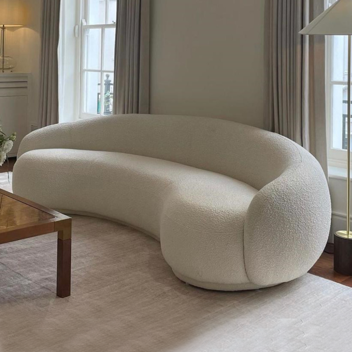 Its sleek curved design serves as a striking focal point in any room, while the plush high-density foam cushions ensure an exceptional lounging experience. Built on a solid wooden frame with expert craftsmanship, this sofa offers lasting durability. Available in neutral tones with a timeless style, it seamlessly complements any interior decor.